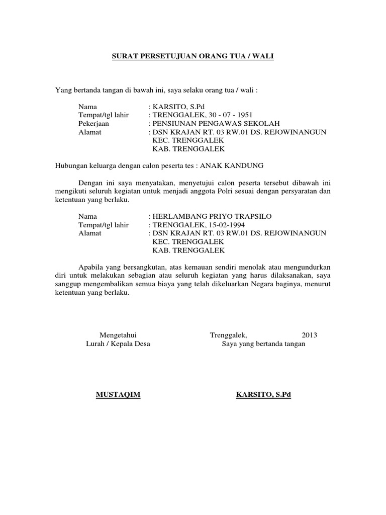 Surat Persetujuan Orang Tua Untuk Menjadi Polisi