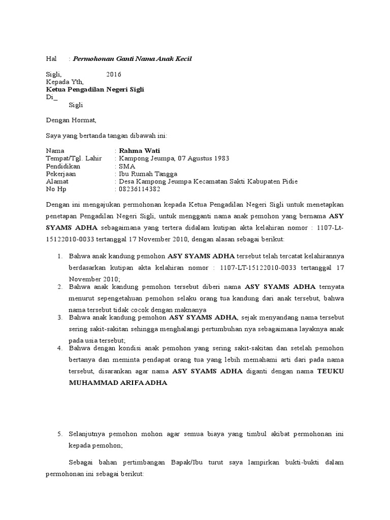 Format permohonan ganti nama anak. Bahwa pemohon lahir di sukoharjo pada tanggal 26 april 1993 sebagaimana tersebut dalam kutipan akta kelahiran no. Klo mau ganti nama anak yang baru umur 3 thn persaratannya gimna.