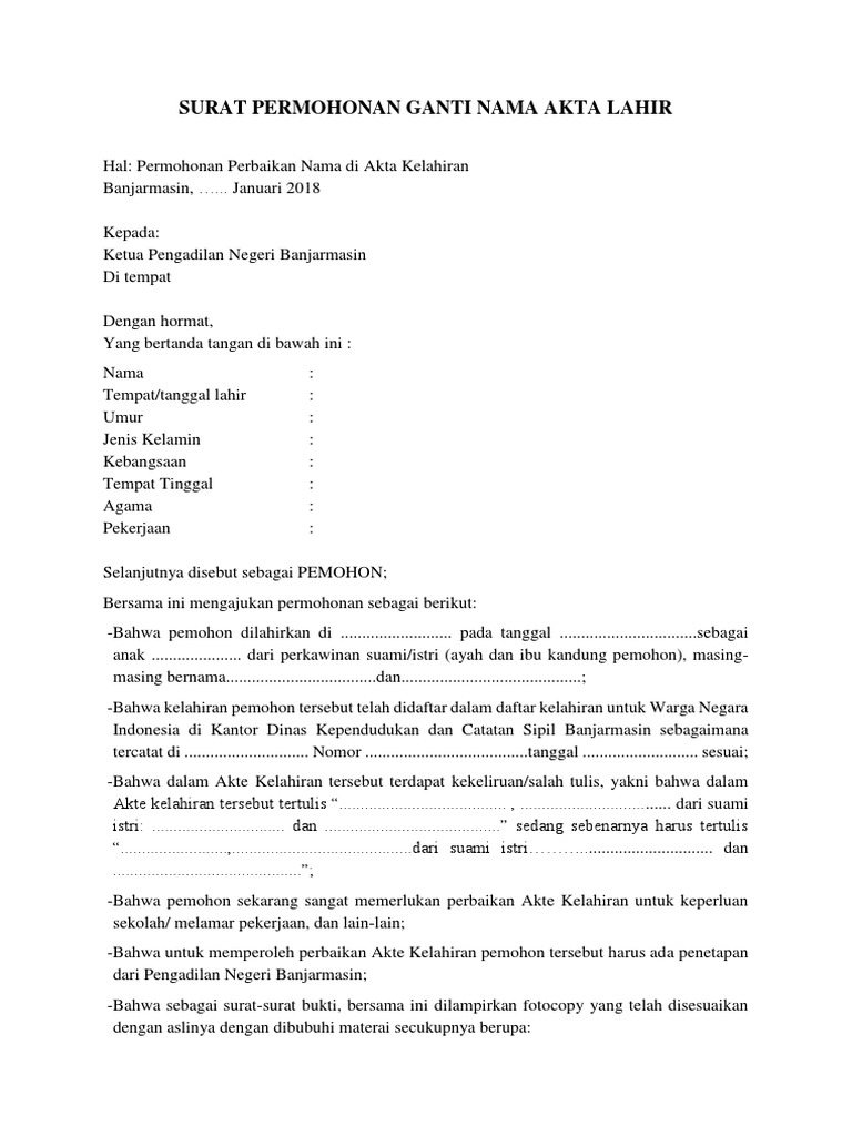 Download dalam bentuk file word. Untuk melakukan penggantian nama atau perbaikan akta kelahiran pihak dinas dukcapil akan terlebih dahulu meminta surat penetapan dari pengadilan negeri setempat. Contoh permohonan pengesahan nama.