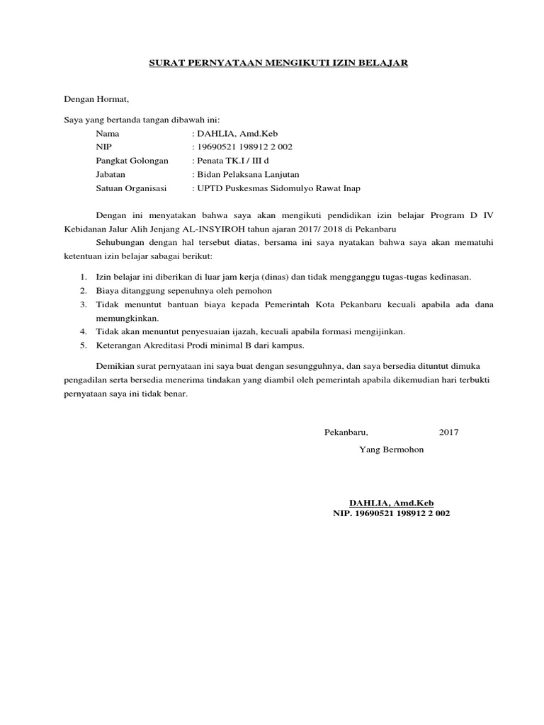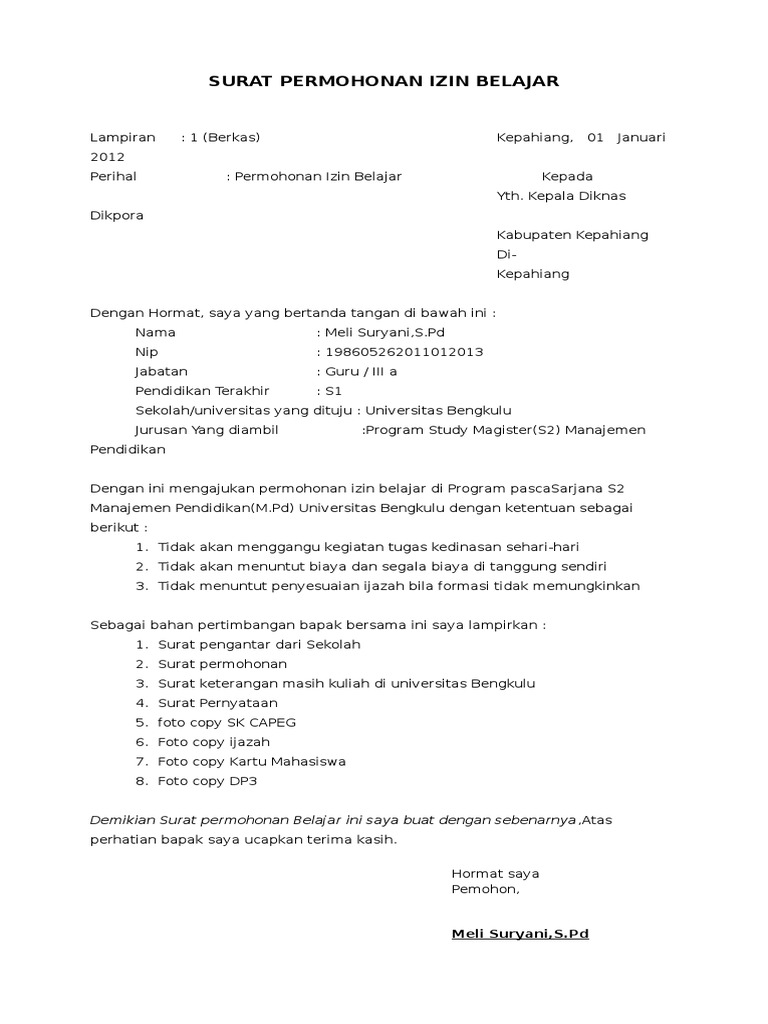 Bkpsdm karanganyar in informasi umum 10 october 2017 0 14564 views format surat pernyataan tidak sedang menjalani hukuman disiplin. Contoh surat permohonan izin belajar guru melanjutkan kuliah magister s2 pendidikan berikut ini adalah contoh tentang contoh surat permohonan izin belajar guru melanjutkan kuliah magister s2 pendidikan seperti surat contoh yang tertulis di bawah ini. Contoh surat permohonan izin belajar.