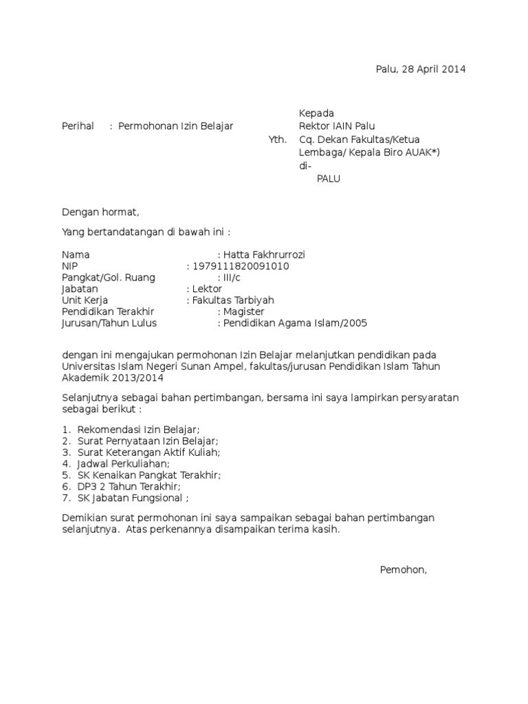Contoh Surat Permohonan Ijin Belajar Doc