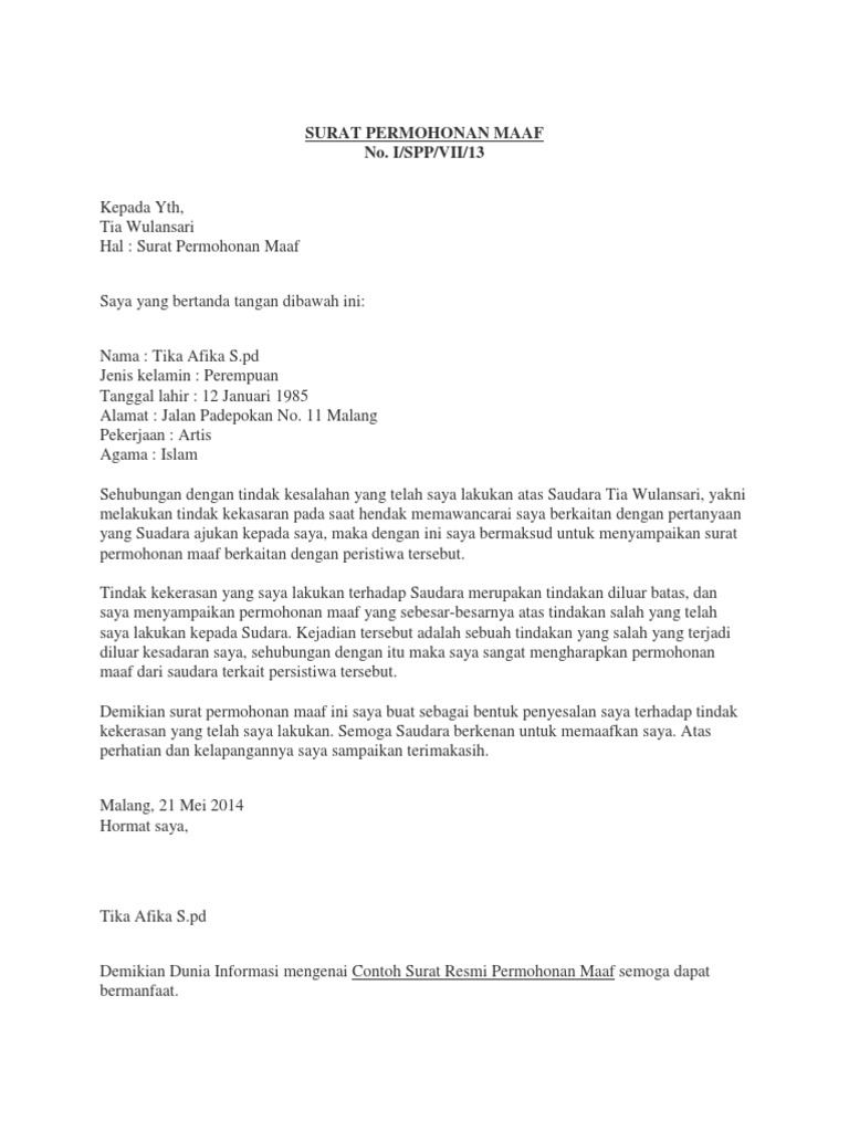Dan bagi anda yg kiranya memang membutuhkan surat permohonan maaf resmi tersebut maka sekarang ini anda sudah dapat membuatnya sendiri. Jakarta 14 september 2013. Terdapat banyak contoh surat permohonan maaf seperti permohonan maaf resmi perusahaan permohonan maaf kepada warga permohonan maaf terbuka dan lain sebagainya.