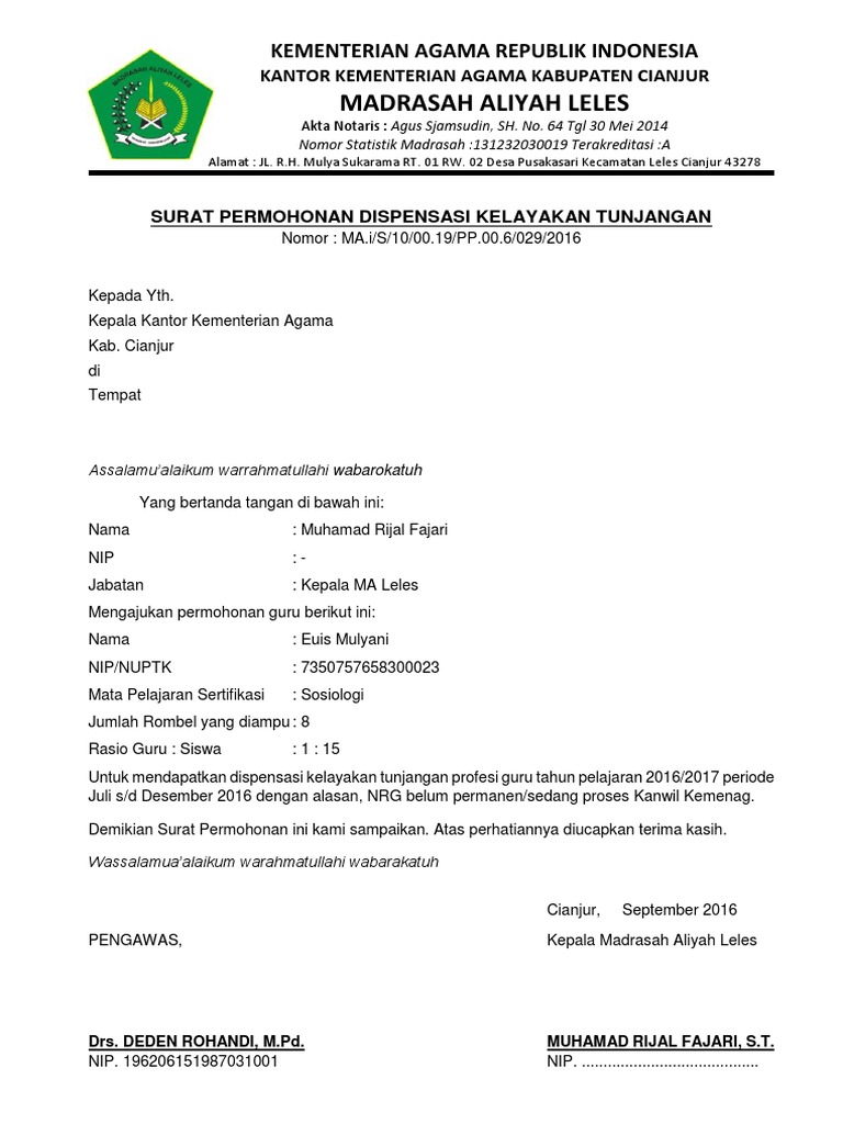 Surat permohonan dispensasi dari kepala ra madrasah kepada kepala kemenag 2. Benarkan madrasah dapat mengajukan dispensasi di beberapa media sosial beredar kabar liar bahwa ra dan madrasah yang memiliki rombongan belajar kelas dengan siswa dibawah 15 tidak memenuhi rasio ideal guru. Contoh permohonan dispensasisilakan downloadcontoh surat permohonan dispensasi.