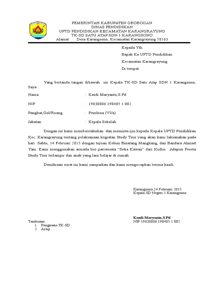 Dengan surat ini kami ingin memberitahukan kepada bapakibu bahwa untuk menambah pengetahuan serta wawasan dan juga pengalaman yang berkaitan dengan ilmu pengetahuan dan teknologi untuk anak didik kami maka dari pihak sekolah ingin melaksanakan kegiatan kunjungan pendidikan study tour yang akan dilaksanakan pada akhir bulan april 2016. Contoh surat ijin orang tua untuk study tour surat ijin orang tua. 0 response to contoh proposal kegiatan study tour post a comment.