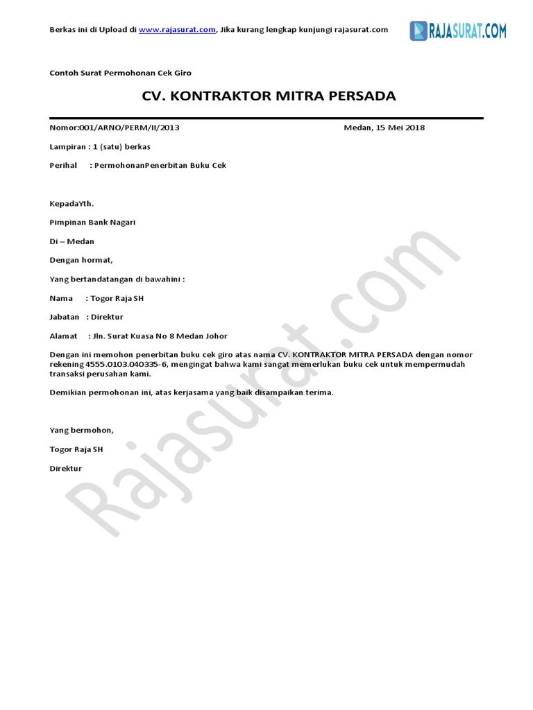 Setelah sebelumnya saya menulis contoh surat referensi sebagai salah satu syarat membuat buku rekening giro perusahaan kini saya akan menulis contoh sebuah surat permohonan buku cek. Karena sebagai sebuah cvudpt kita perlu yang namanya buku cek pengertian cek cheque adalah. Bagi tujuan pengeluaran wang sekurang kurangnya dua tandatangan ahli jawatankuasa tertinggi diperlukan bagi mengesahkan cek berkuatkuasa mulai tarikh surat ini.