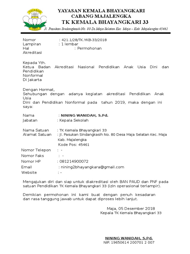 Contoh Format Surat Permohonan Akreditasi Sekolah Paud Tk Dikmas
