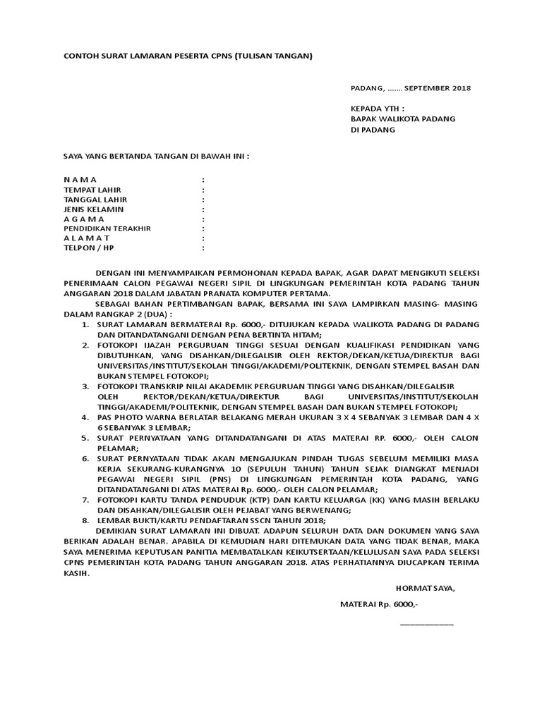 Contoh Surat Lamaran Dan Pernyataan Pelamar Cpns Kota Padang